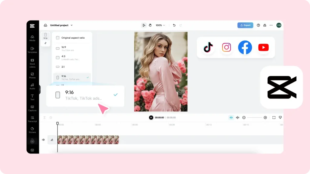 In today’s diverse social media landscape, videos must fit various aspect ratios for platforms like YouTube, TikTok, Instagram, Facebook, and LinkedIn. CapCut simplifies this process with a single click.