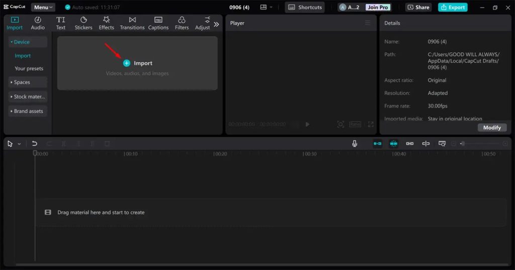 Open CapCut Pro and click “Import” to upload media from your device. You can also use media from CapCut stock materials. After this, drop the media in the timeline.